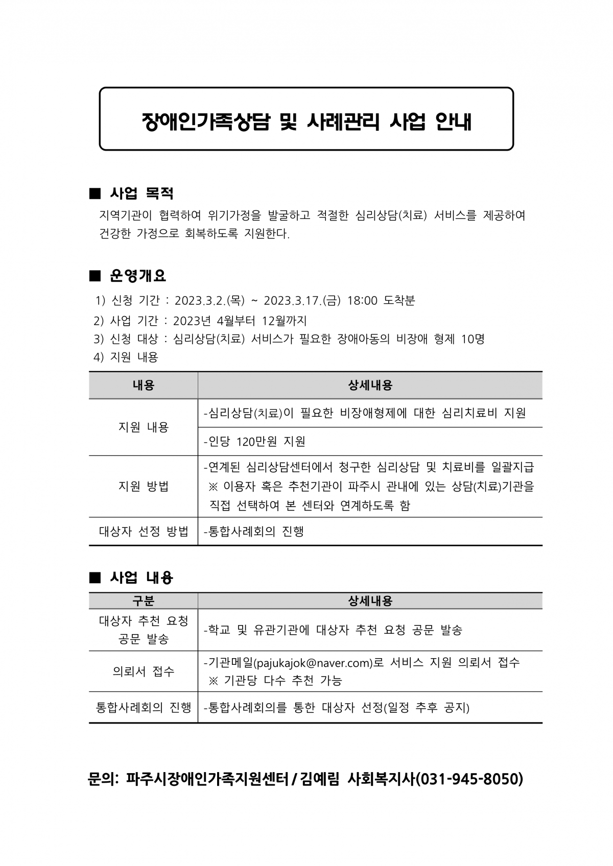 문의사항은 파주시장애인가족지원센터(031-945-8050)로 연락 부탁드립니다.