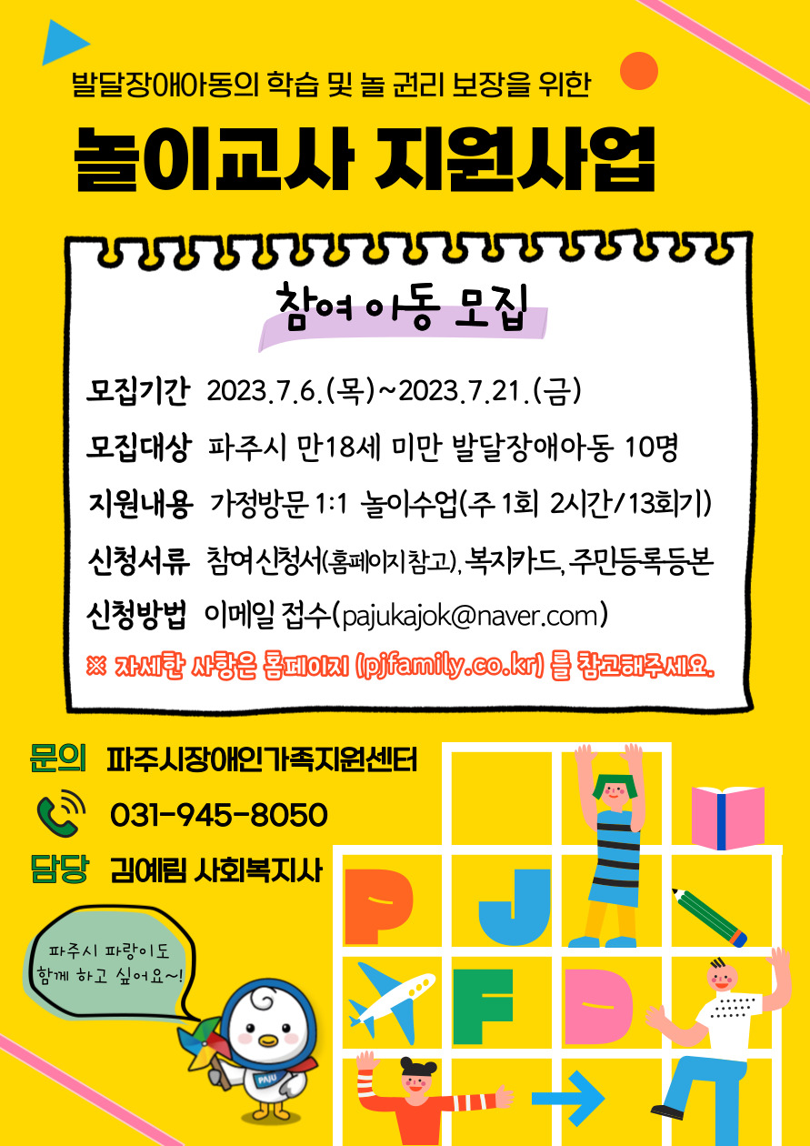 「파주시와 함께 진행하는 발달장애아동 놀이교사 지원사업」의 참여자를 아래와 같이 모집합니다. □ 사업 개요 ○ 모집인원 : 10명 ○ 지원내용 : 가정방문 1:1 놀이수업 주 1회(1회기당 2시간), 총 13회기 진행 ○ 지원자격 : 파주시에 거주하는 만 18세 미만 발달장애아동 등록/미등록 이주배경아동 포함 □ 추진계획 ○ 신청기간 : 2023. 7. 6.(목) ~ 7. 21.(금) ○ 신청방법 : 개별 신청 ○ 제출서류 : - 참여신청서 및 개인정보 수집·이용 동의서 - 복지카드 앞뒷면 사본 (장애인등록증명서 가능) - 주민등록등본 (가족관계증명서 가능) - 우선순위 증명서 (해당자만 제출) ※ 기준 중위소득의 120% 이하 가정 , 한부모, 다문화, 다자녀 가정, 2021년 ~ 2022년 연속 참여 아동 ○ 제출방법 : 이메일 접수(pajukajok@naver.com) ○ 선정방법 : 선착순이나, 우선순위 해당자가 있을 시 우선 선정 ○ 문 의 : 파주시장애인가족지원센터(☎ 031-945-8050)