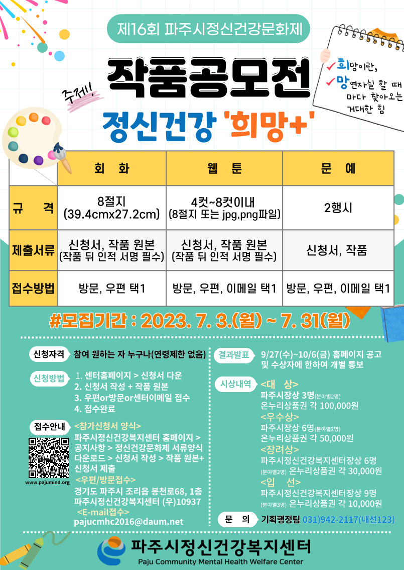 [홍보] 파주시정신건강복지센터 "제16회 파주시정신건강문화제:작품공모전"