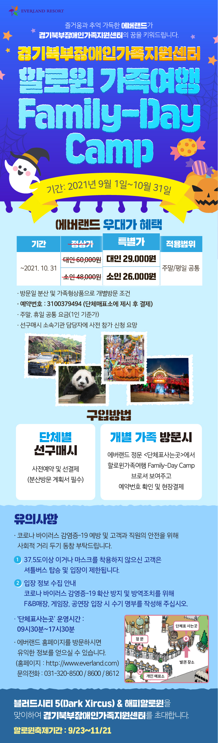 [구입방법]방문시 에버랜드 정문 <단체표사는곳>에서 할로윈가족여행 Family-Day Camp 브로셔 보여주고 예약번호 확인 및 현장결제