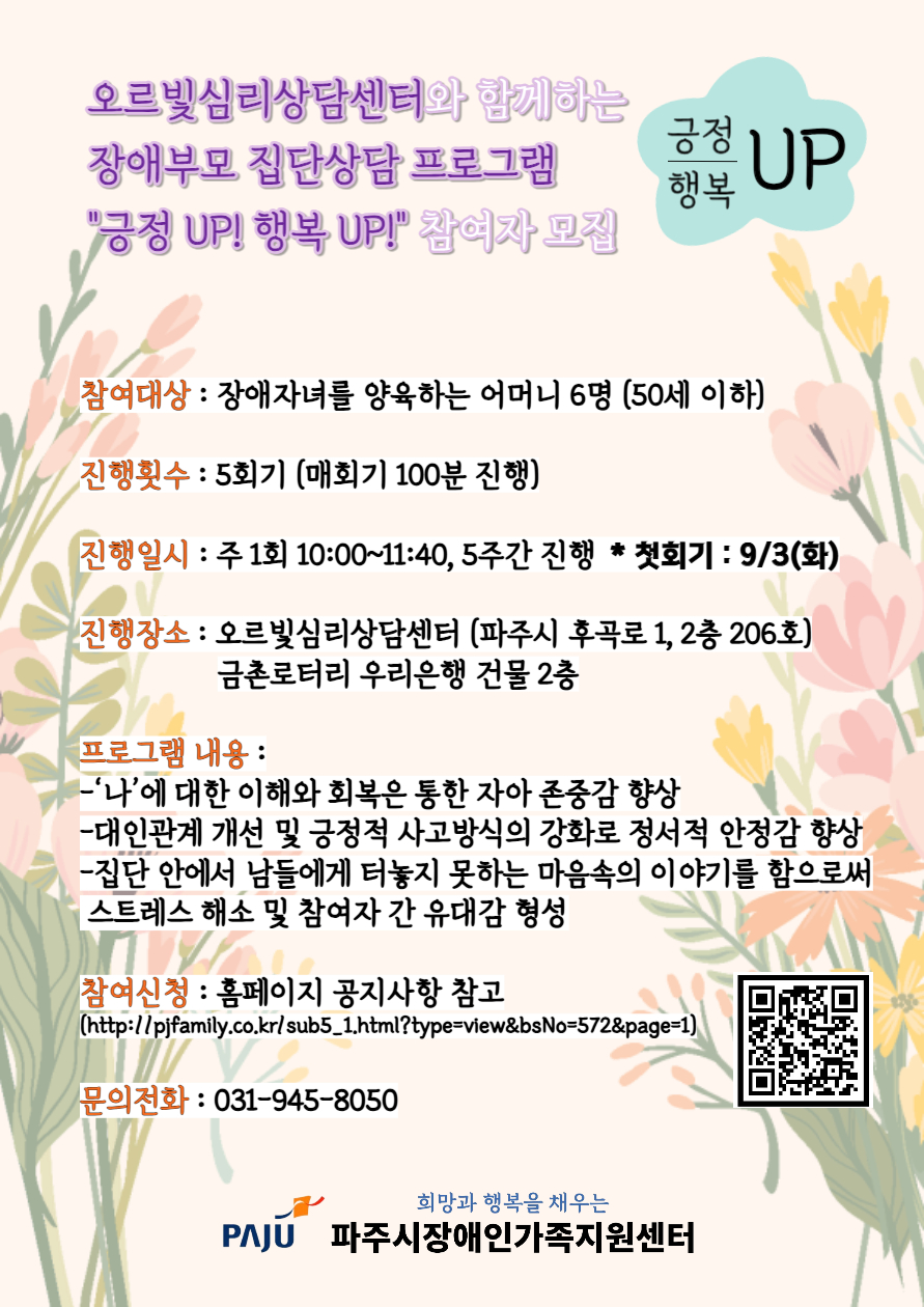 [모집마감] 오르빛심리상담센터와 함께하는 장애부모 집단상담 프로그램 "긍정 UP! 행복 UP!" 참여자 모집 안내