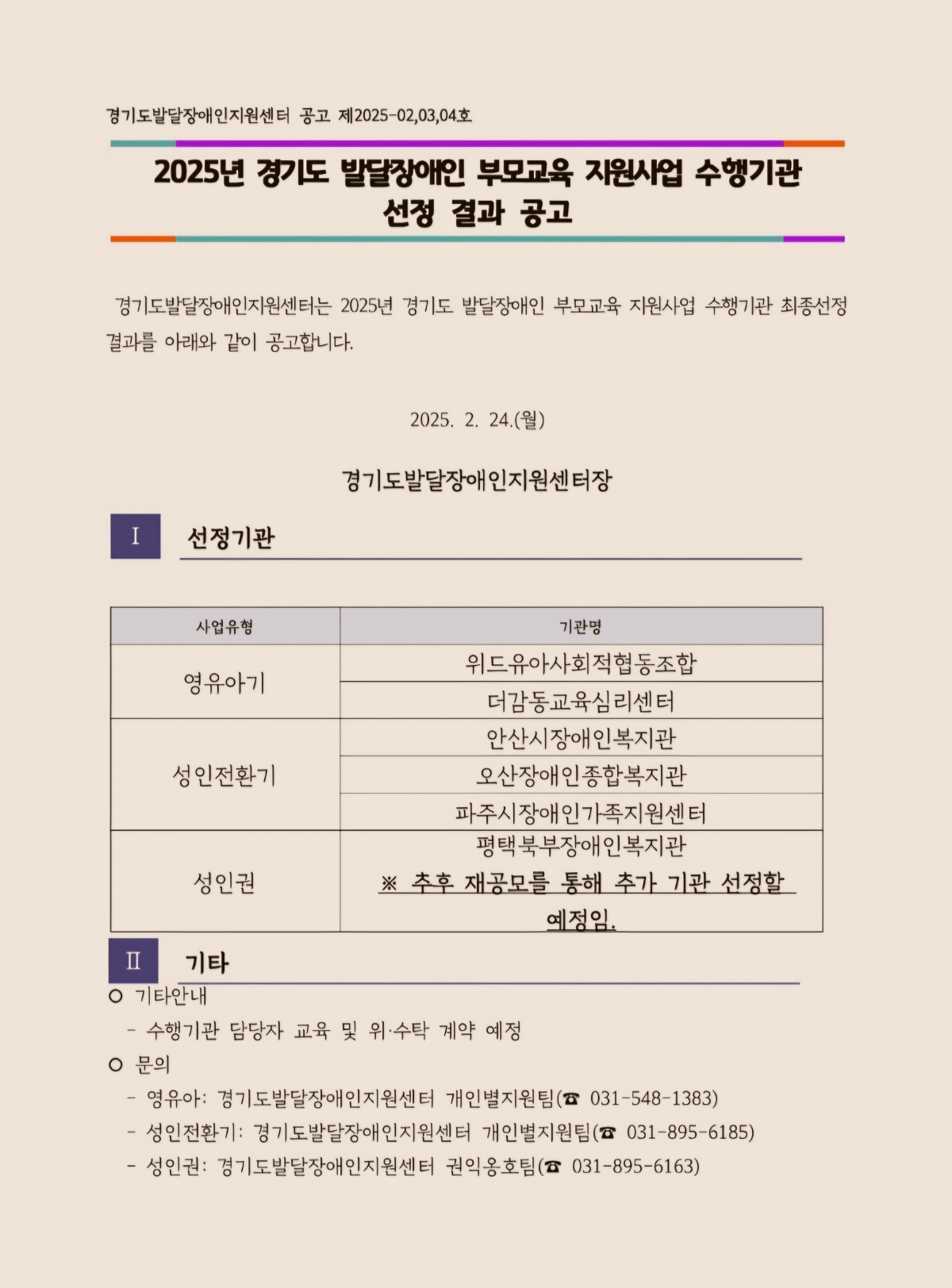 [공고] 2025년 경기도 발달장애인 부모교육 지원사업 수행기관 선정 결과 공고