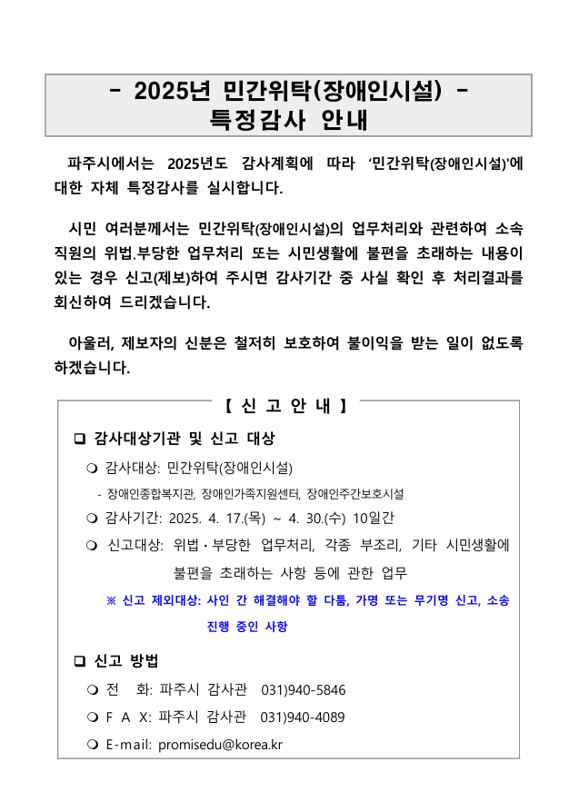 [공고] 2025년 민간위탁(장애인시설) 특정감사 실시 안내
