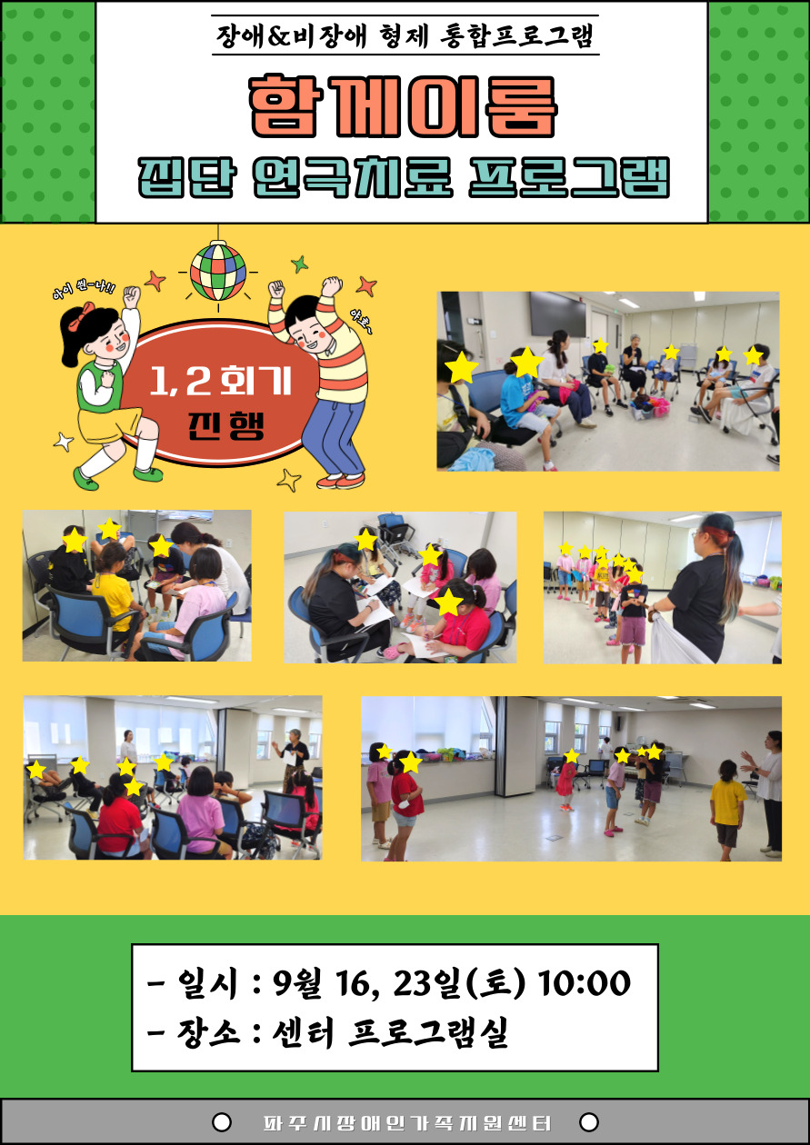 지난 9월 16일(토)에 센터 프로그램실에서 장애&비장애 형제 통합프로그램 '함께이룸' 첫 회기가 진행되었습니다.