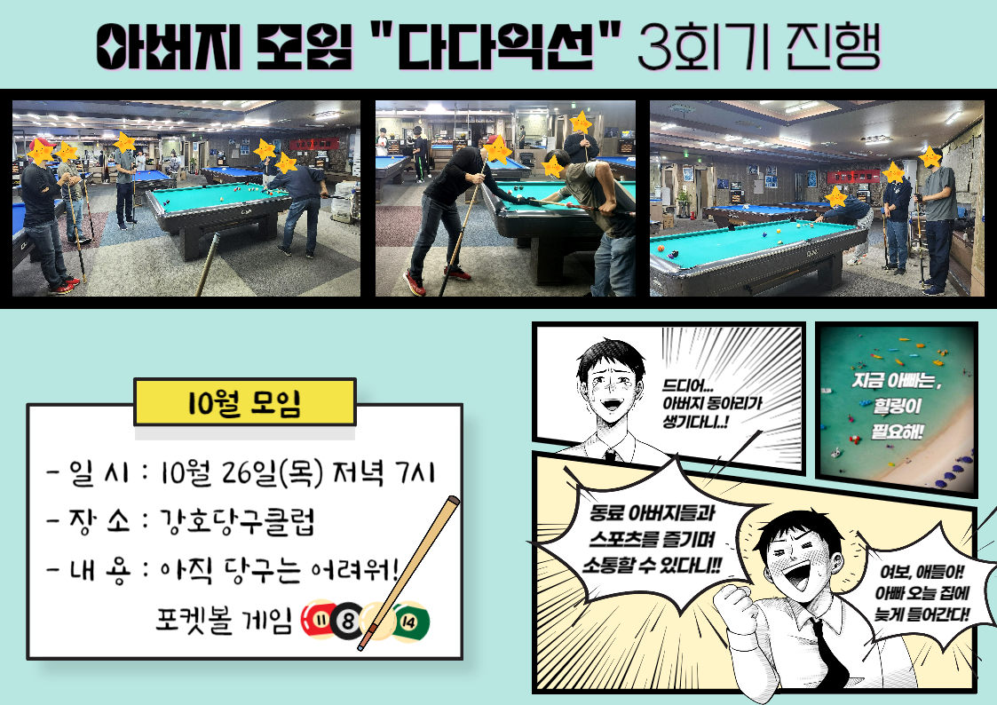 지난 10월 26일(목) 저녁 7시에 금릉역 부근에 위치한 강호당구클럽에서 아버지 모임 3회기를 진행하였습니다 ^^