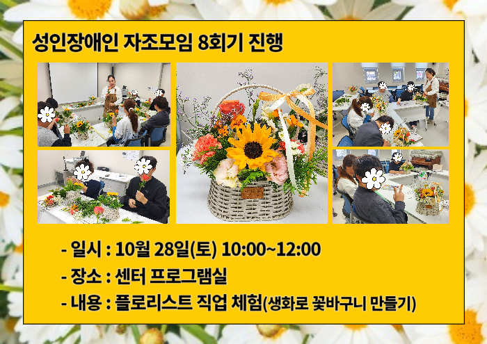 지난 10월 28일(토) 10시에 센터 프로그램실에서 성인장애인 자조모임으로 플로리스트 직업 체험의 시간을 가졌습니다.