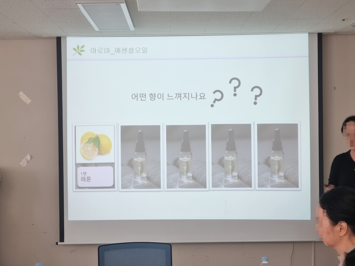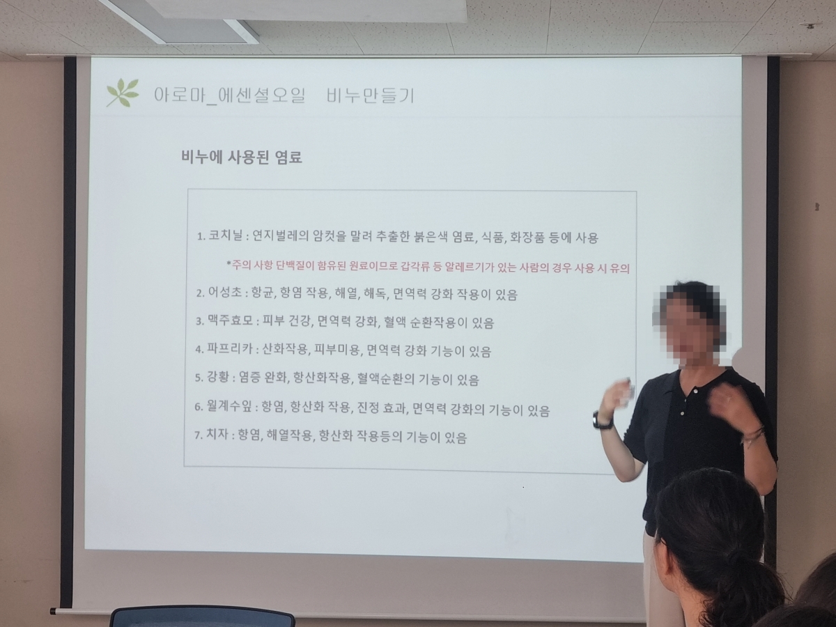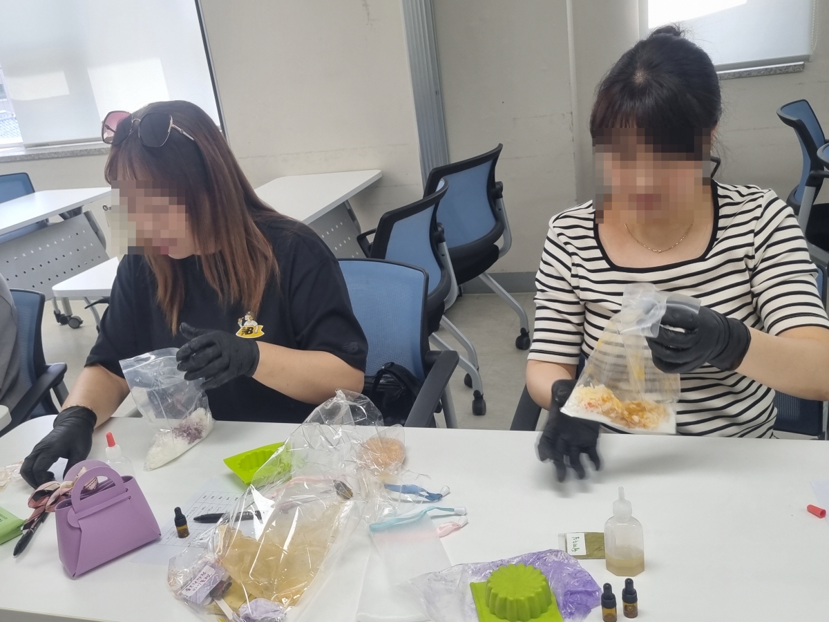 어머님들이 힘들고 온몸이 뻐근한 운동을 하시다가 정적인? 비누 만들기를 시작하니 미소가 눈에 보였습니다.