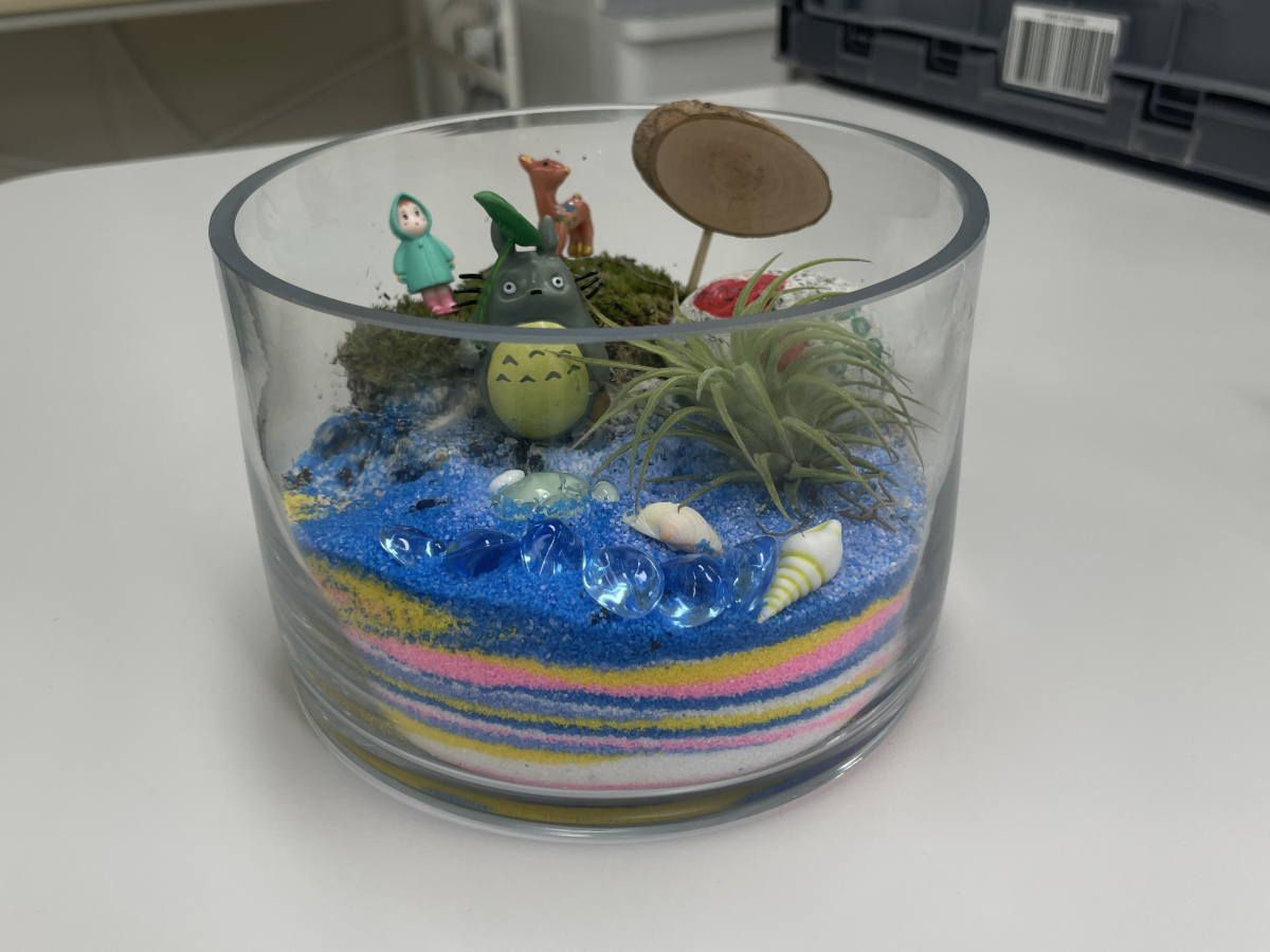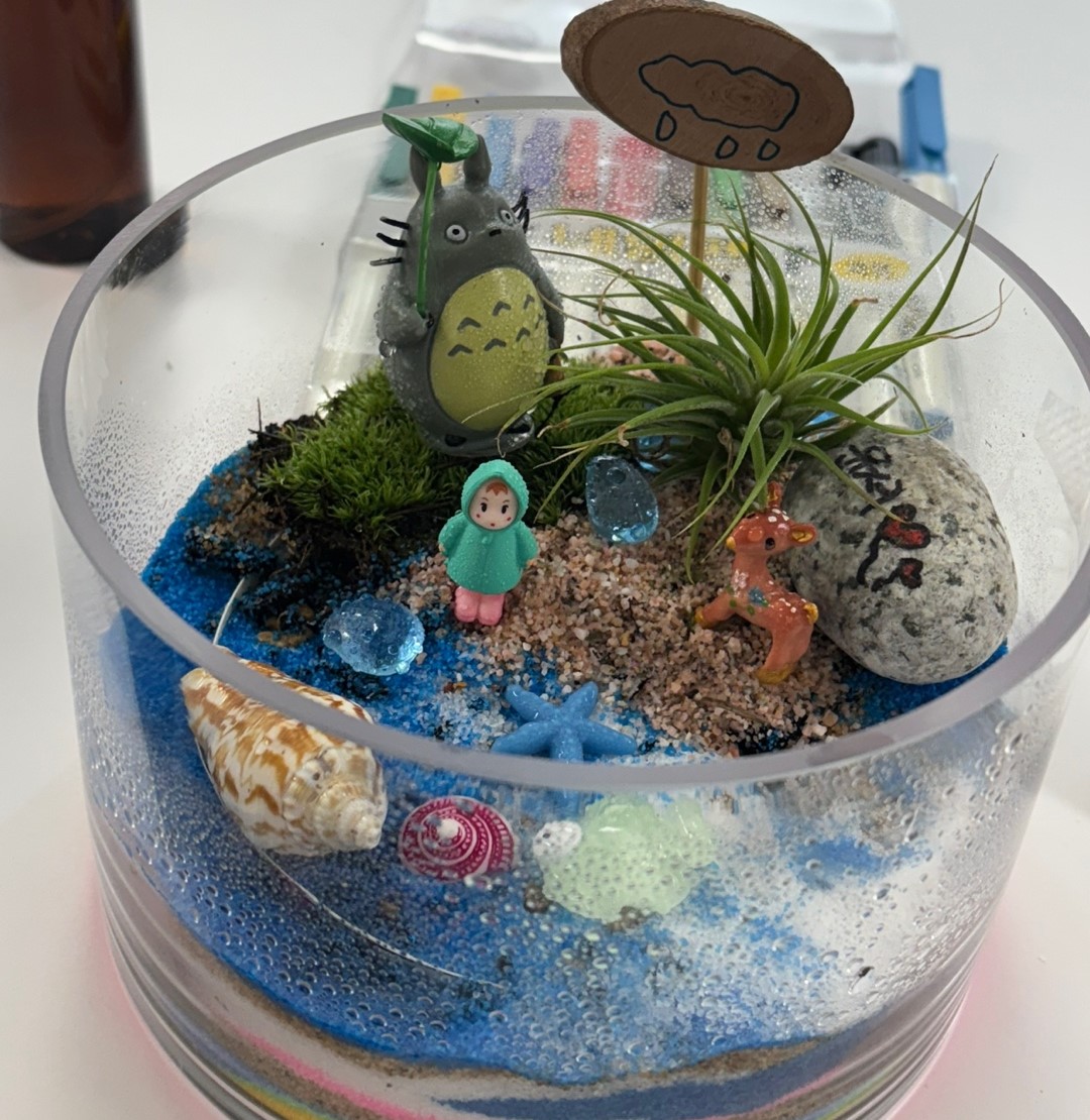 먼저 알록달록 모래를 넣어주고 이끼, 작은 식물들을 이용해 테라리움 작품을 만들었습니다.