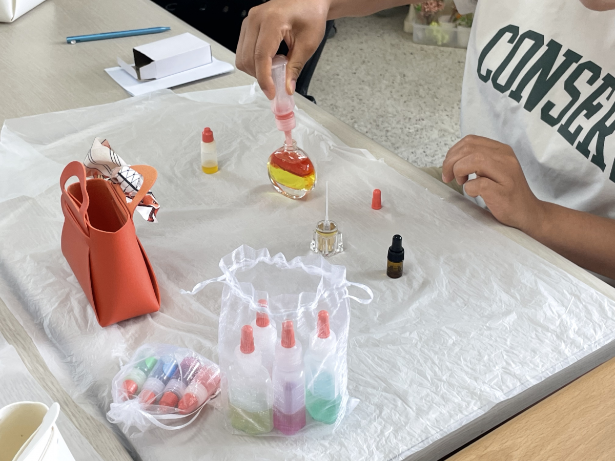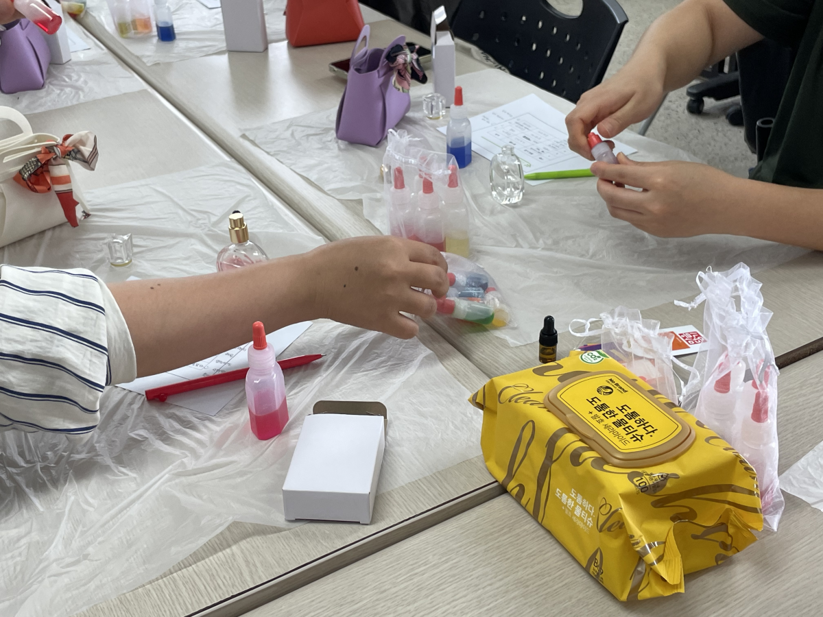 원하는 색을 골라 수용성 지용성으로 나눠 투톤 향수를 만들고있습니다.