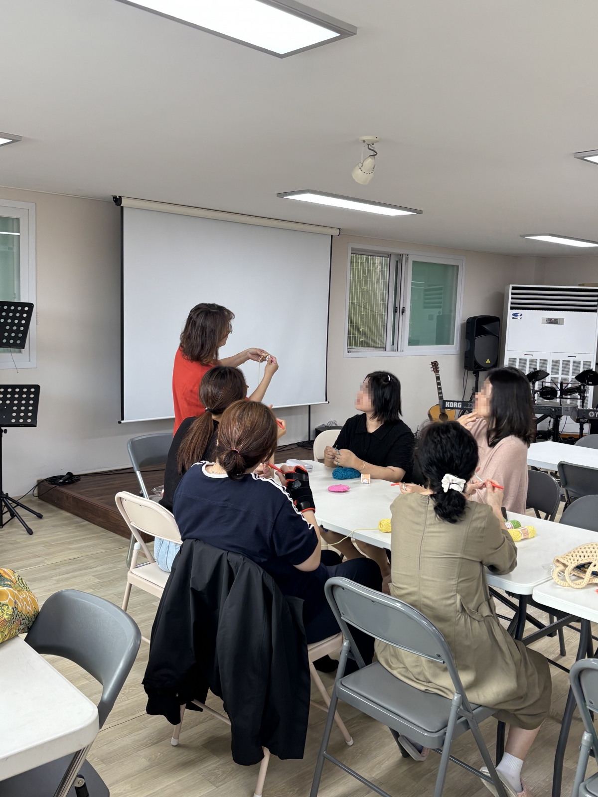 열심히 경청하시는 어머님들 수세미 실 구멍이 잘 안보여서 힘겨워 하셨지만 열정 넘치게 활동하셨습니다.