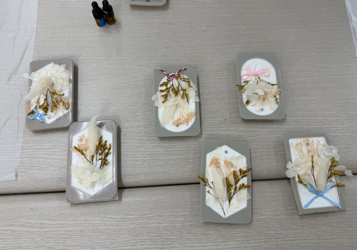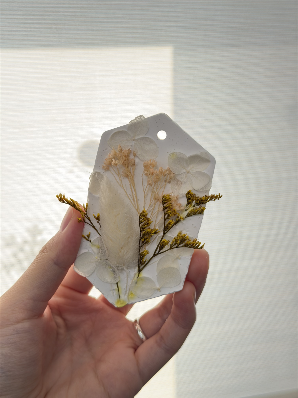 아로마오일과 석고반죽을 섞어 틀에 붓고, 프리저브 플라워를 배치해 굳을 때까지 기다려줍니다.