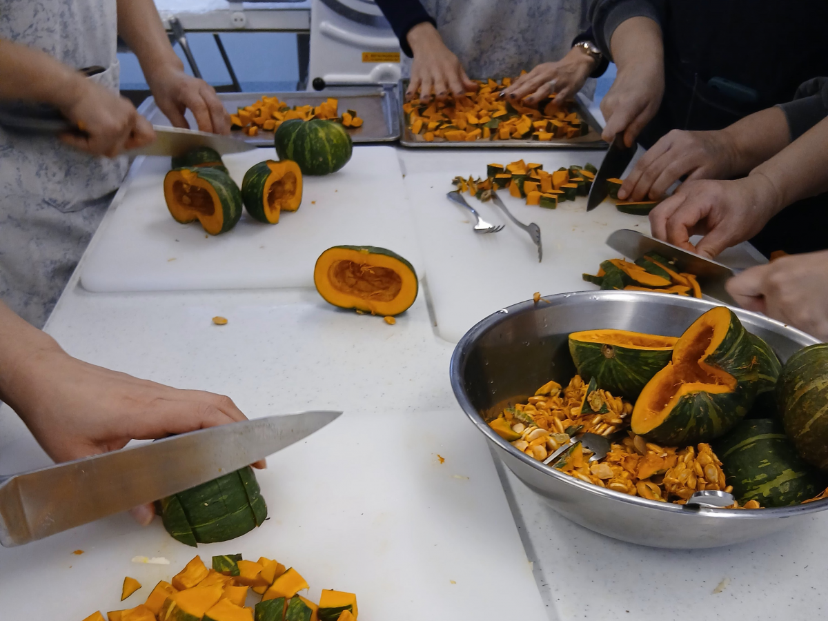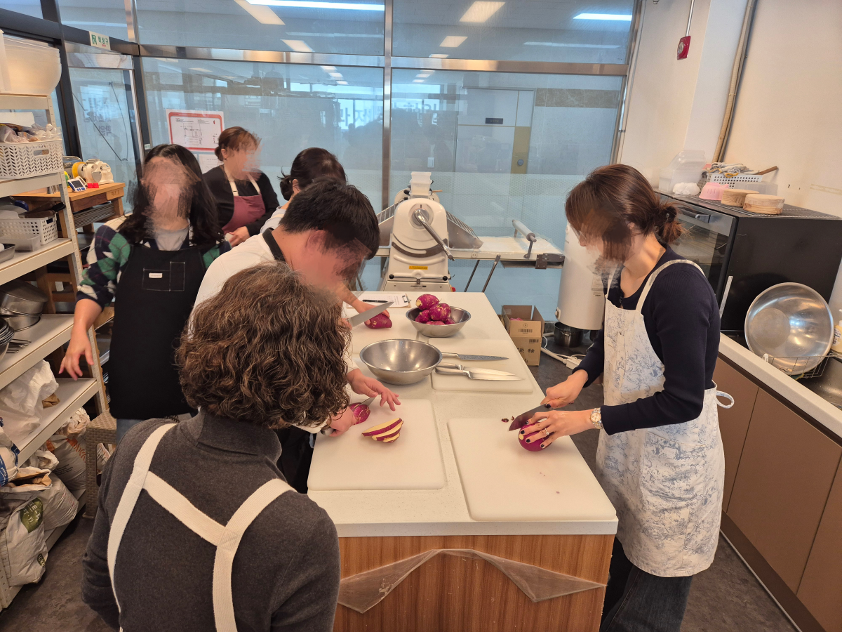 반죽을 만든 후 토핑으로 올라갈 고구마와 단호박 재료 손질을 하시는 모습입니다.