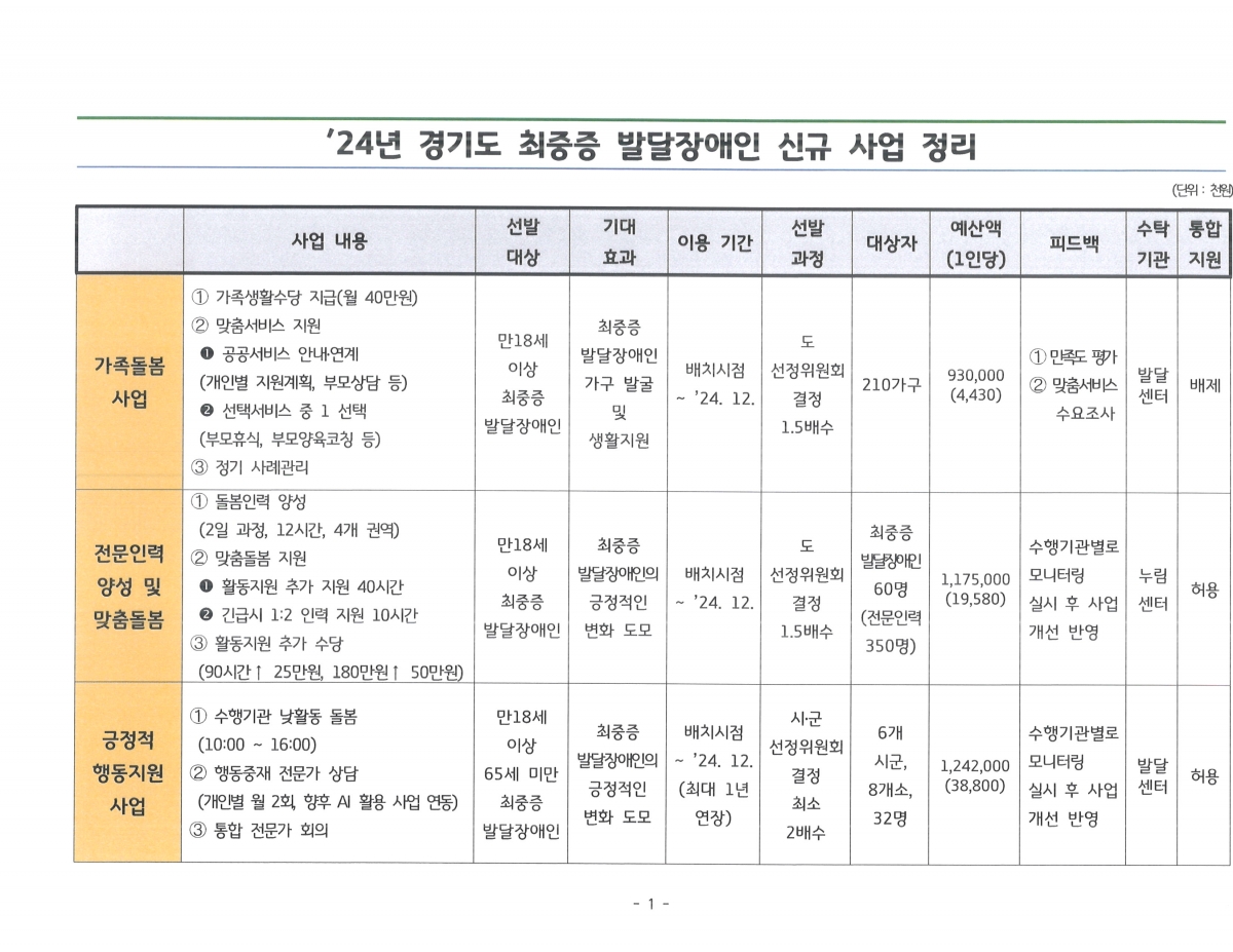 2024년 경기도 발달장애인 신규 사업으로, '최중증 발달장애인 맞춤돌봄 및 가족돌봄 사업' 이 4월부터 시작됩니다.