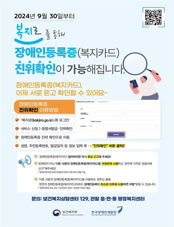 보건복지부가 오는 30일부터 ‘복지로(bokjiro.go.kr)’를 통해 ‘장애인등록증 진위확인 서비스’와 ‘모바일 장애인 등록’ 신청을 개시한다고 26일 밝혔다.