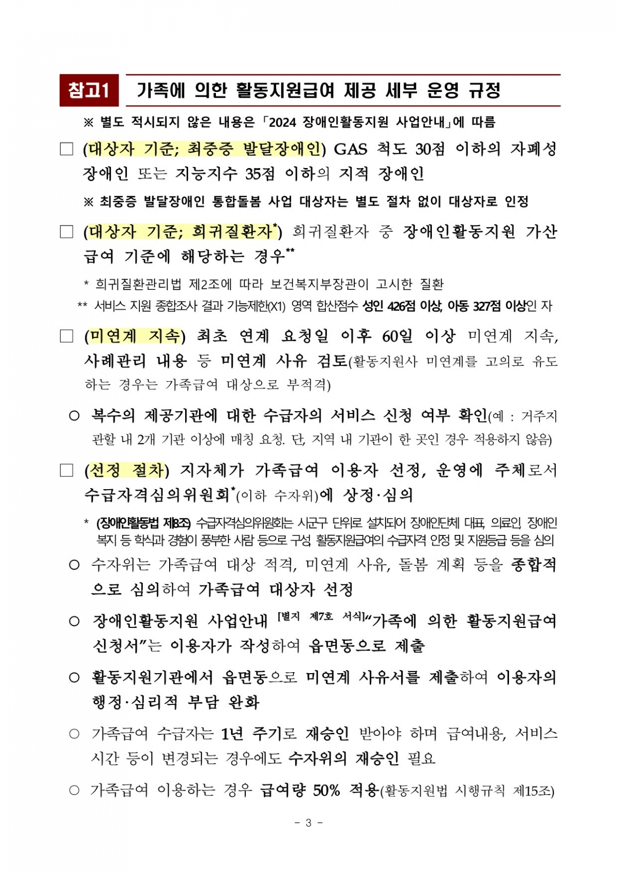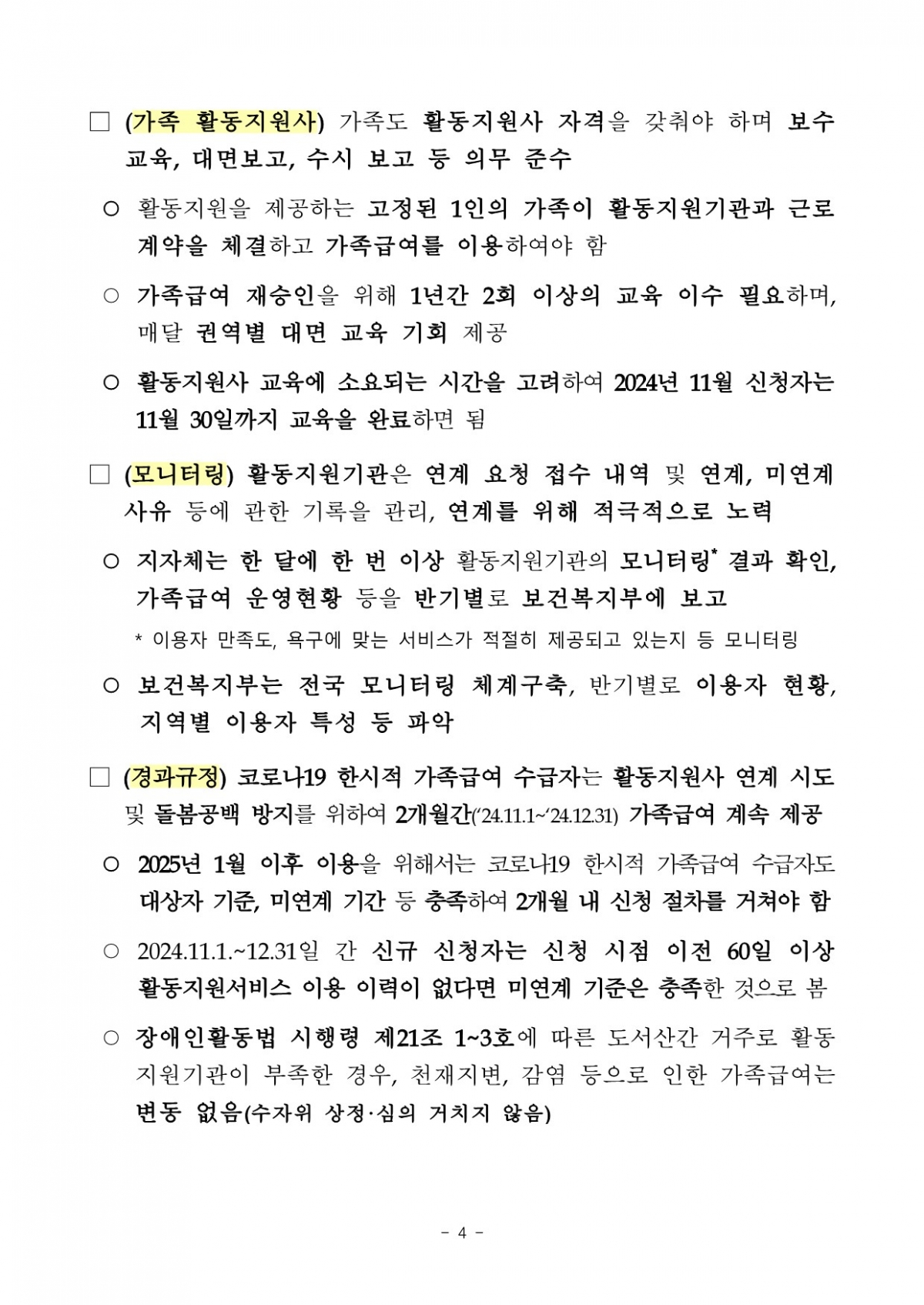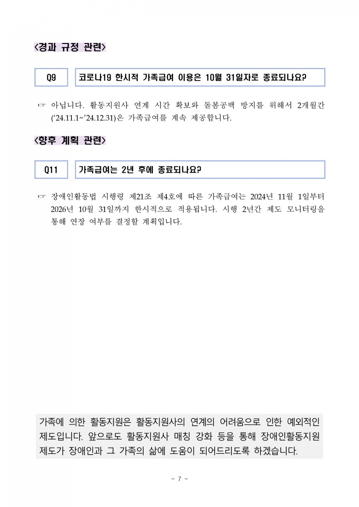 한편, 코로나19 기간 동안 운영했던 한시적 가족급여는 당초 이달 31일 종료 예정이었으나 이용자의 활동지원사 연계 기간 확보 및 돌봄 공백 방지를 위해 올해 말까지 계속 지원한다.