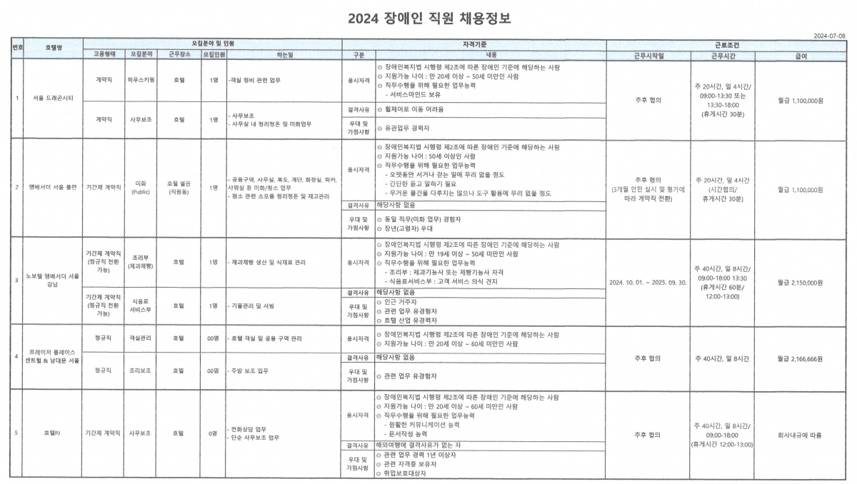 | 5 | 호텔PJ | 기간제 계약직 | 서울 | 사무보조 | 0 | - 전화상담 업무 - 단순사무보조업무 |